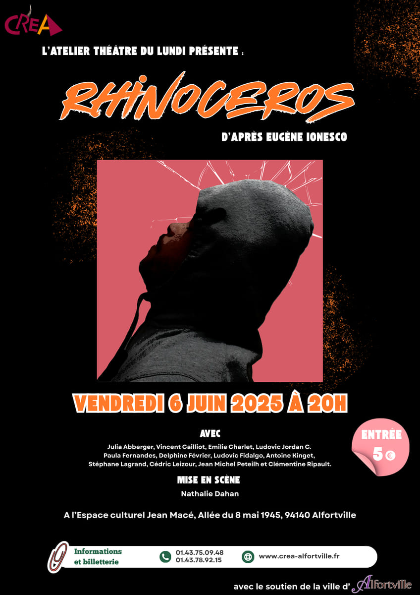 vendredi 6 juin 2025 à 20h : "Rhinocéros" d'après Eugène Ionesco, représentation de l'atelier théâtre du lundi, mise en scène par Nathalie DAHAN.